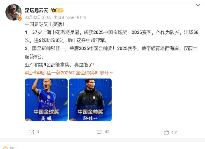 先来说李金羽,他在上个赛季发达也很惊艳,带领辽宁铁东说念主一齐过关斩将,带领球队夺得中甲冠军,还顺利冲超告捷,面临这么的发达,难说念莫得阅历取得年度最好教诲吗?他已经败给邵佳一,难说念邵佳一也带领青岛西海岸夺得中超冠军吗?