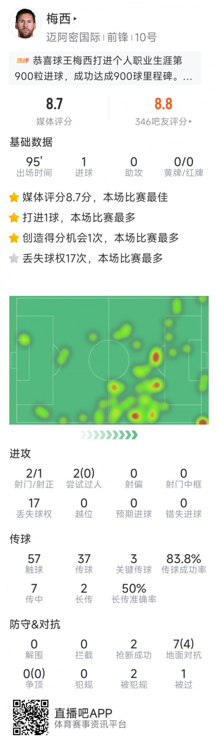 直播吧3月19日讯在好意思冠杯1/8决赛次回合,迈阿密外洋1-1战纳什维尔,博亚体育app官方入口梅西竣事生计900球里程碑,以下为梅西本场数据: