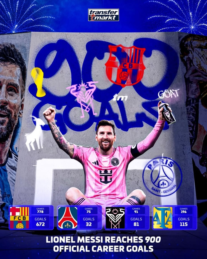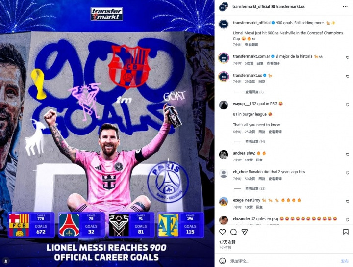 海报底部翰墨写着:梅西已矣生存900个负责比赛进球。