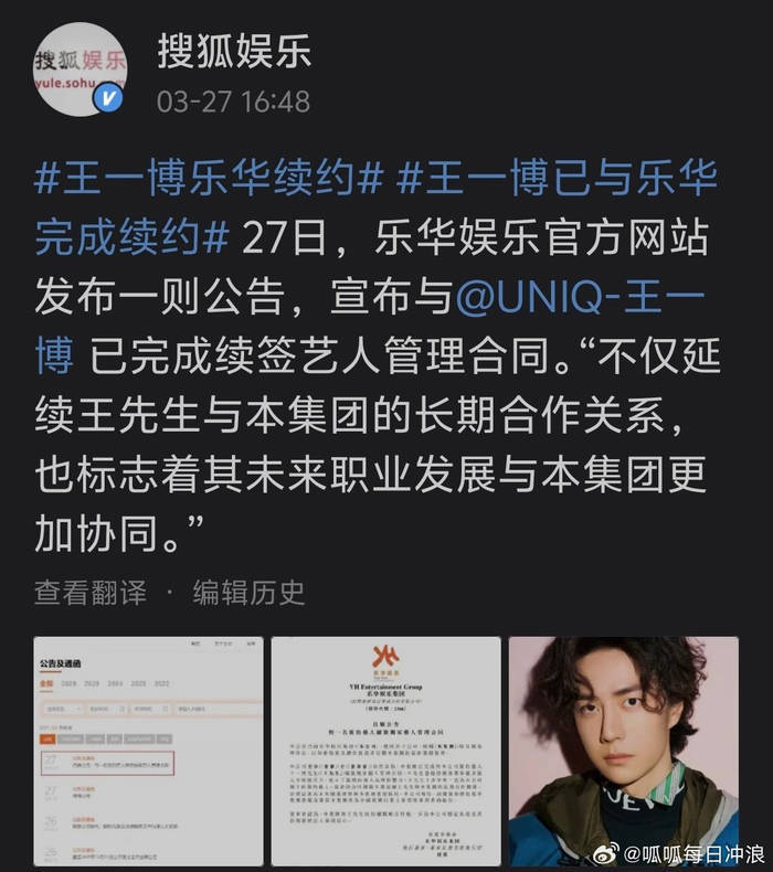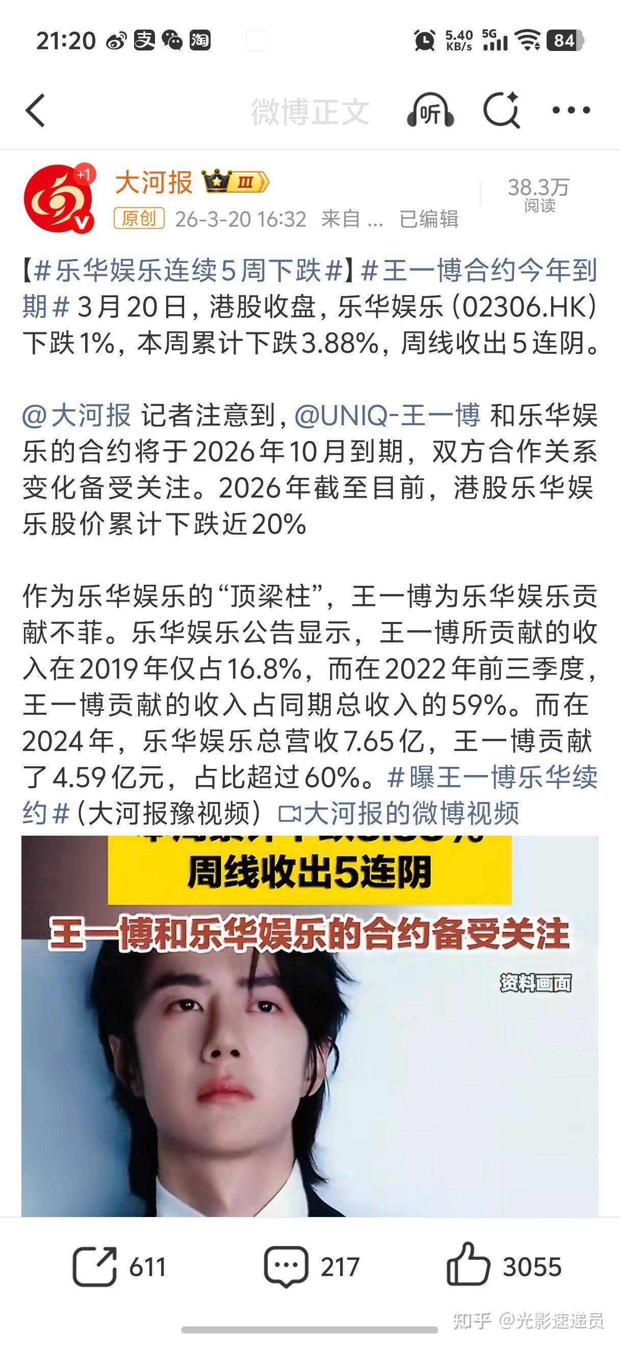 3月27日,乐华文娱在港交所发布公告称,集团已完成与公司签约艺东说念主王一博续签独家艺东说念主措置条约。这一音问让商场松了连气儿,毕竟王一博动作乐华文娱的中枢艺东说念主,其续约与否平直考虑到公司的估值和发展远景。