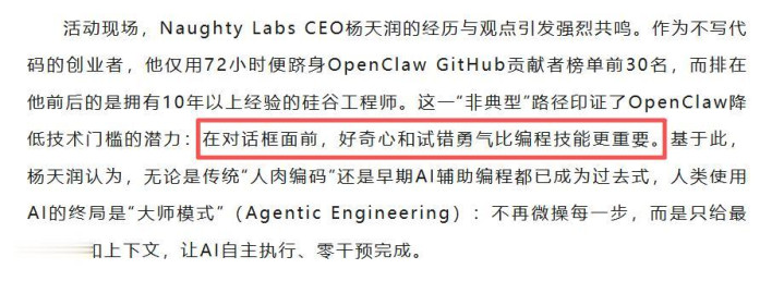 这让我思起另一个故事。杨天润,一个从不写代码的文科生,在OpenClaw火起来后,仅用72小时就冲上了GitHub(注:门径员齐在用的代码共享网站)孝敬者榜单前30名,排在他前后的,是领有十年以上教养的硅谷工程师。