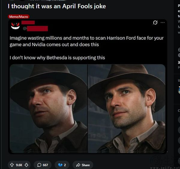 濒临黄仁勋选藏飘溢地声称DLSS 5是“图形限制的GPT时刻”,玩家社区却是以漫天的嘘声回话。只是一天时候,针对DLSS 5的讥刺梗图就在X、Reddit等支吾平台无数出现,玩家们攻讦DLSS 5生成的画面充斥着低价的AI滋味,挥霍了原来成就者想要抒发的艺术立场,误会了游戏原来的好意思学立场。
