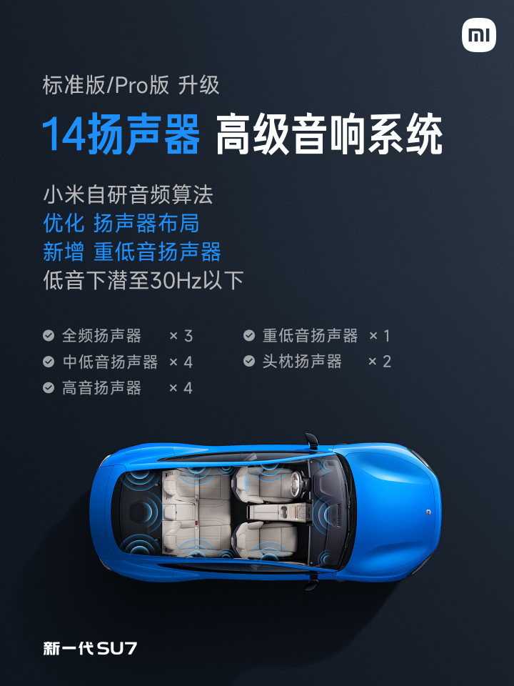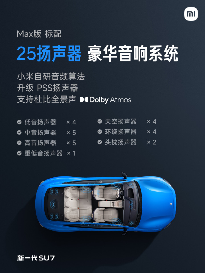 新一代SU7还标配四门静音夹胶玻璃,Max版不错选配超静谧座舱,期骗超110处声学材料。