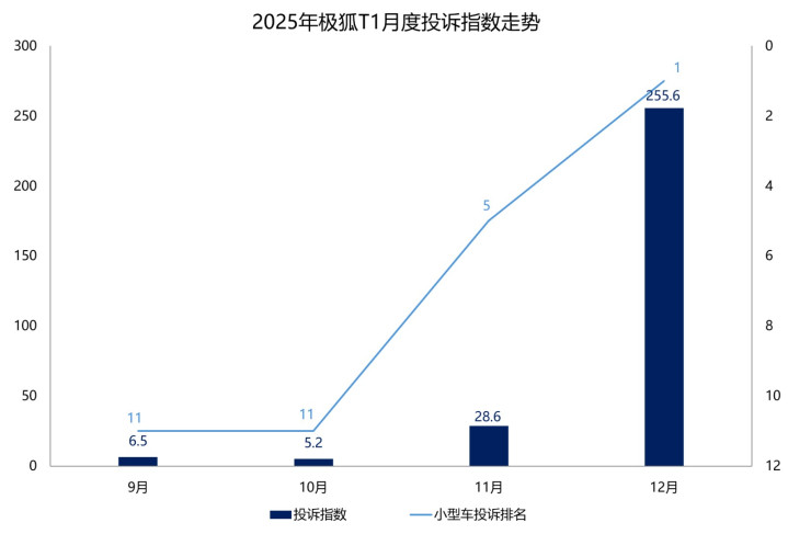 汽车门网数据显现:2025年极狐T1的投诉指数达到了295.9,冲到了年度微型车投诉指数榜单第4名。从月度走势看,2025年12月,极狐T1投诉指数大幅攀升至255.6,环比涨幅近8倍,排在了当月微型车投诉指数榜首。
