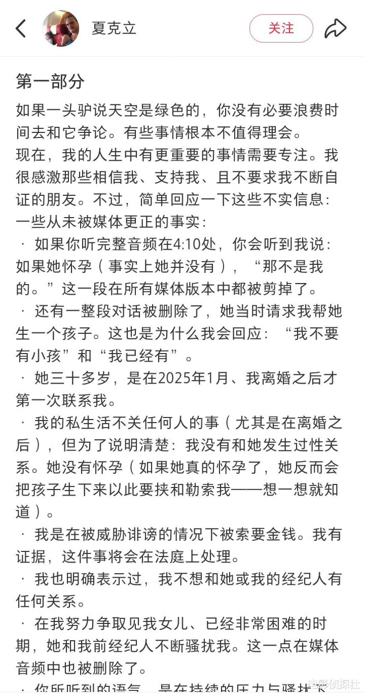 而这场离异讼事的余波一直莫得平息,2025年8月,葛斯王人初次爆料夏克立婚内出轨,并公开疑似其瞻念照,直到本年3月底,更是放出了一段长达5分钟的灌音,让总共这个词事件再次冲上热搜。