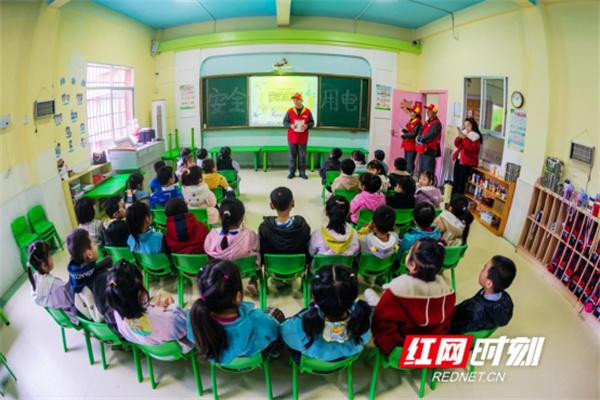 “电小松”志愿作事队队员正在为双牌县工业园区幼儿园小一又友上安全用电课。