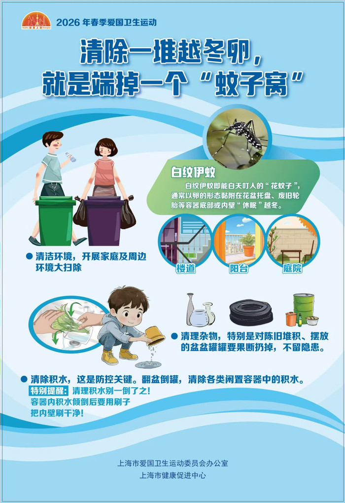 据先容,算作将按“周”鼓励:3月23日起为“春季蚊虫繁殖环境算帐周”,3月30日起为“春季灭鼠协调投药周”,4月20日起为“春季成蚊消杀放手周”;4月27日起开展为期两周的病媒生物防制相干国法查验;4月至5月扩充《上海市引子白纹伊蚊督察放手指南》;4月23日起为“卫生成规相干规劝周”,办法社区、单元和住户开展环境清洁算作。