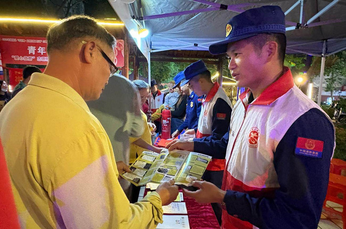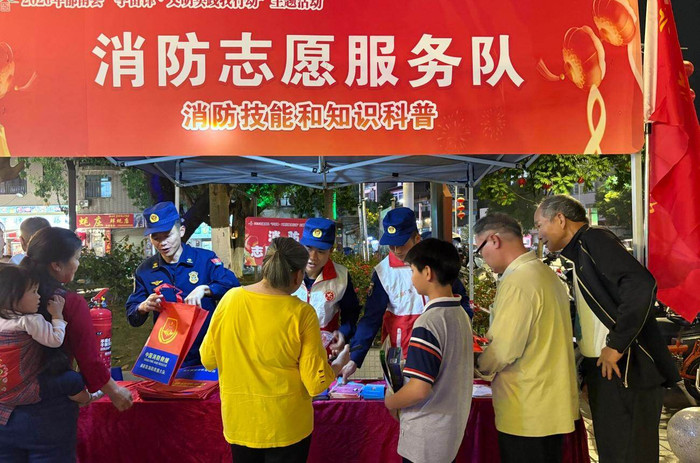 3月18日晚,郁南县“四季村晚”活动现场东说念主头攒动。消防志愿就业摊位前围满了东说念主。