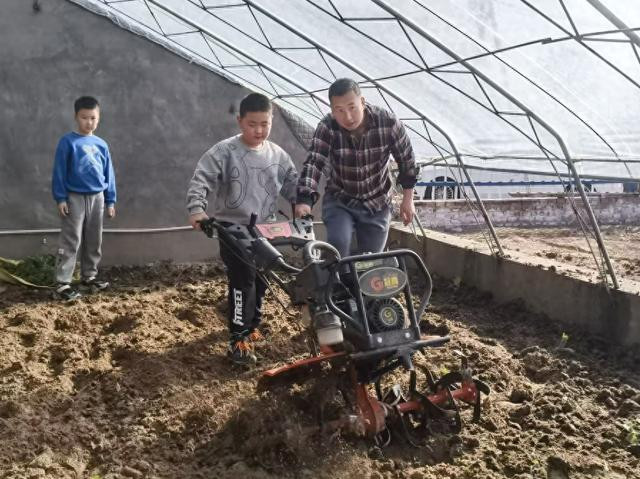 张保帅(右)组织青少年开展农耕实实验为,在温室大棚教孩子们使用耕地机器高苗摄