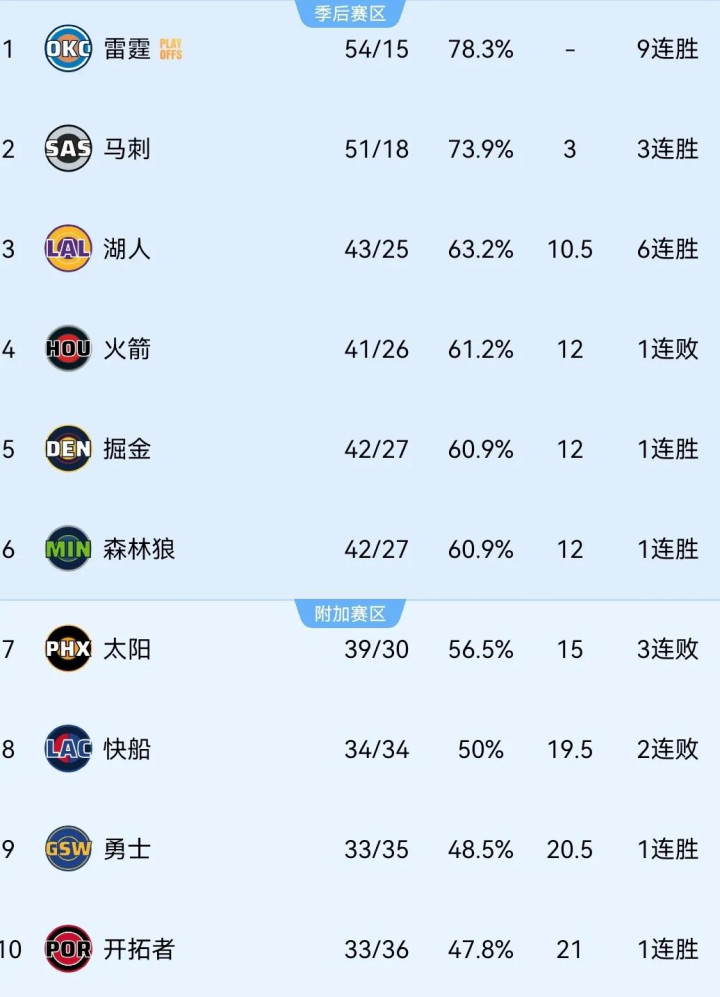 本赛季于今,雷霆战绩为54胜15负高居西部&定约榜首,马刺51胜18负和湖东说念主43胜25负紧随后来。