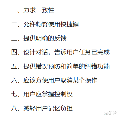 而操作冗余仅仅交互问题的冰山一角。在交互遐想限制,有一册被庸碌援用的经典文章叫《用户界面遐想——灵验的东说念主机交互战术》,其作家转头了八项黄金法例。我把截图放在这里,人人可以肤浅看一下: