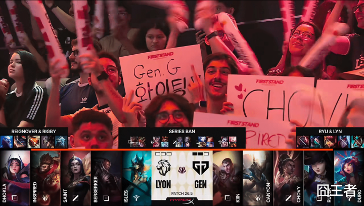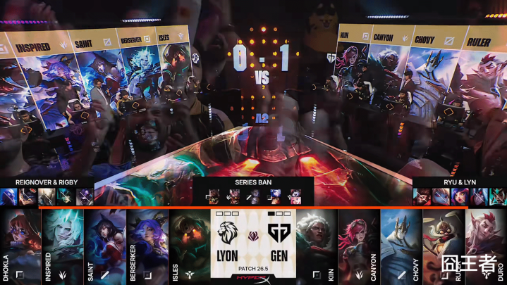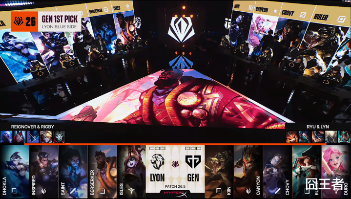 第二局比赛,LYON蓝色方,禁用:瑞兹;兰博;潘森;娜好意思;毒头,给与:Dhokla阿萝拉;Inspired佛耶戈;Saint阿狸;Berserker芸阿娜;lsles泰坦;GEN红色方,禁用:卡尔玛;韦鲁斯;妮蔻;波比;山公,给与:kiin狼母;Canyon蔚;Chovy加里奥;Ruler飞机;Duro洛
