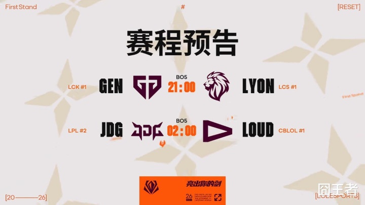 今天的赛程安排是,由GEN对阵LYON,以及济河焚州的JDG对阵LOUD。GEN应该是稳胜的,JDG由于第一轮负于GEN,是以对阵LOUD,是他们的济河焚州。他们谁胜谁负呢,就交给赛场上来一决上下吧。