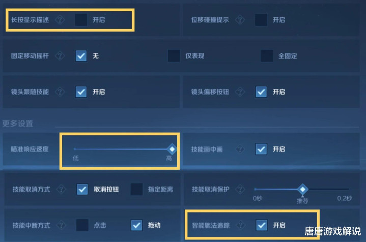 起初将长按显现描绘关掉,然后在更多建设中,把对准反应速率拉到最高,临了掀开智能施法跟踪功能,主张出当今报复限度内,长按就能自动对准。