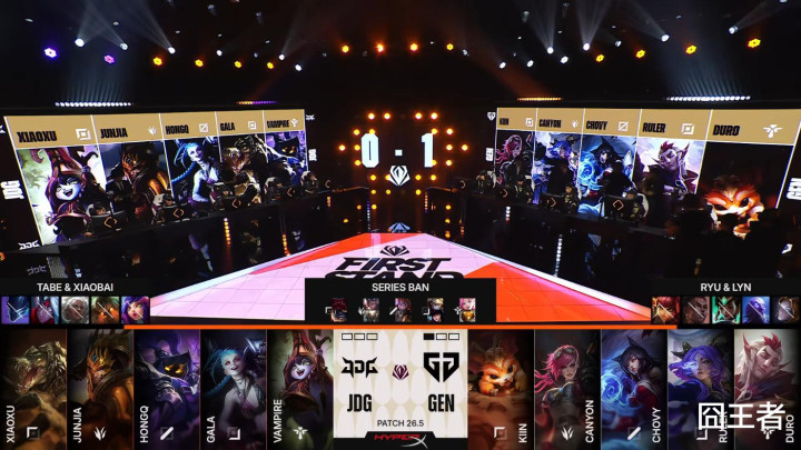 第一局比赛,JDG蓝色方,禁用:发条、瑞兹、韦鲁斯、轮子妈、烬,接收:Xiaoxu山羊、Junjia赵信、HongQ兔子、GALA EZ、Vampire歌姬;GEN红色方,禁用:扇子妈、皇子、蔚、加里奥、奎桑提,接收:Kiin兰博、Canyon潘森、Chovy卡牌、Ruler女警、Duro巴德