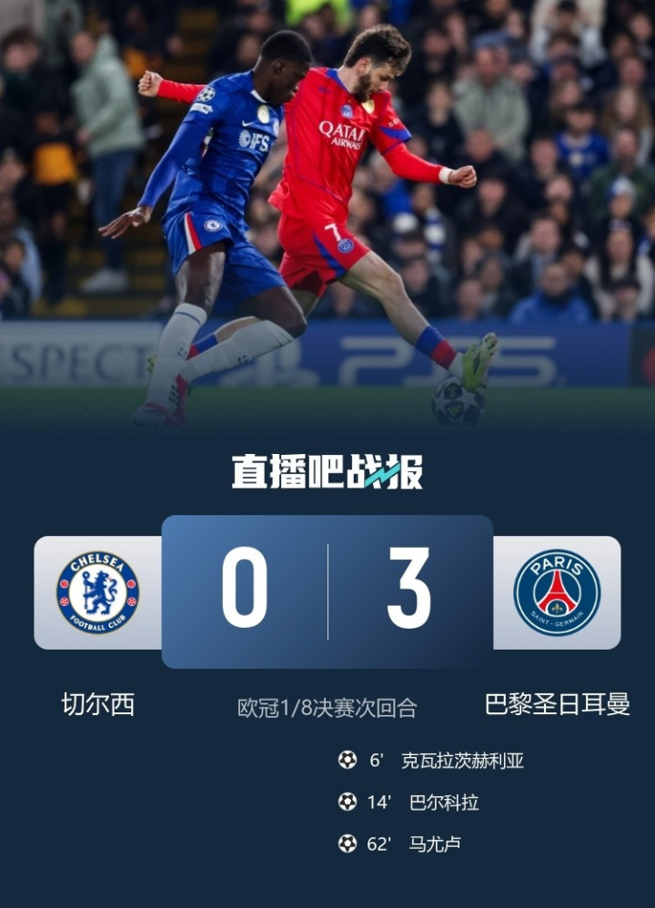 直播吧3月18日讯欧冠1/8决赛次回合,切尔西主场0-3不敌巴黎圣日耳曼,总比分2-8不敌视手,无缘八强。