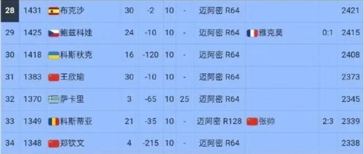 从最新的即时排行榜单来看,郑钦文在扣除前老大阿密1000赛的215个八强积分后,她的排行如故从第26位下滑到了第33位;王欣瑜则以第31位的排行跃到了小郑的前边,成为了新中国一姐。