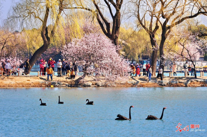 2026年3月18日,北京颐和园西堤,山桃花竞相开放,与岸边吐绿的垂柳情味横生。昆明湖碧波漂泊,几只黑天鹅闲适游弋博亚体育app官方入口,游东谈主散步赏春。(刘宪国摄/光明图片)
