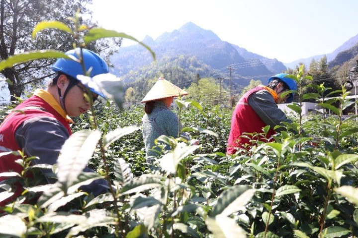 国度电网重庆电力(城口营销)红岩共产党员干事队队员匡助茶农采摘茶叶。邓芝华摄