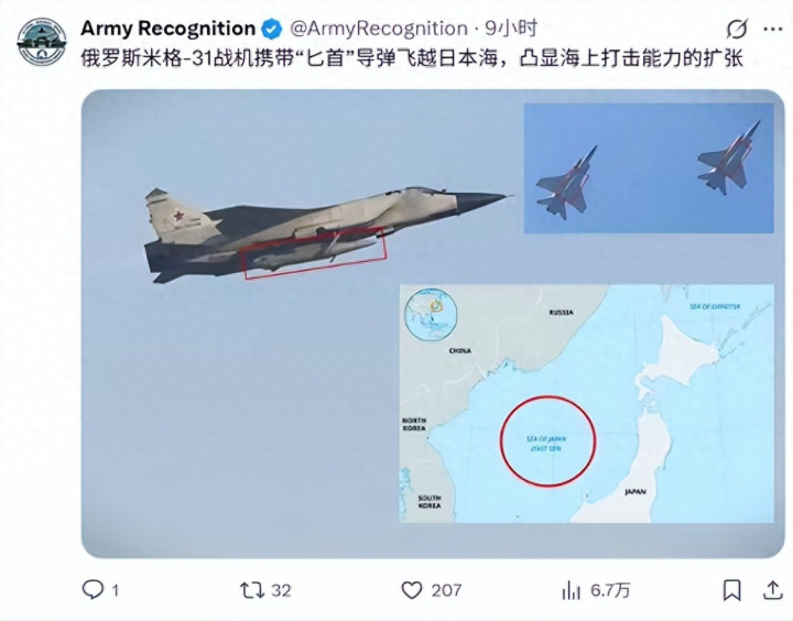 手脚对日本在九有部署12改导弹的复兴,俄军展示了快速打击日本原土的才智。近日,俄罗斯空天军2架米格-31K战机挂载“匕首”精粹音速导弹飞越了日本海中立水域。