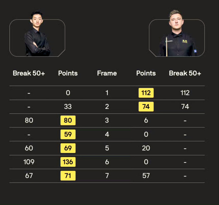 全场比赛,吴宜泽打出一杆109分和三杆50+(80、60、67),威尔逊打出一杆112分和74分。