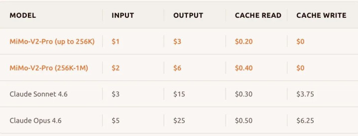 MiMo-V2-Pro和Claude的API功绩收费范例