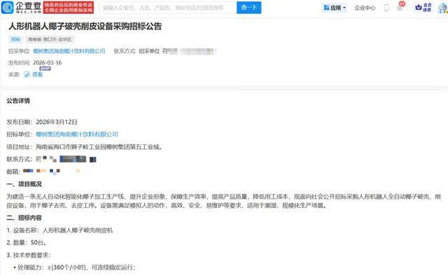 近日,椰树集团海南椰汁饮料有限公司发布一则采购公告,拟采购50台东说念主形机器东说念主,挑升用于椰子的破壳与削皮状貌,激发阛阓轻柔。