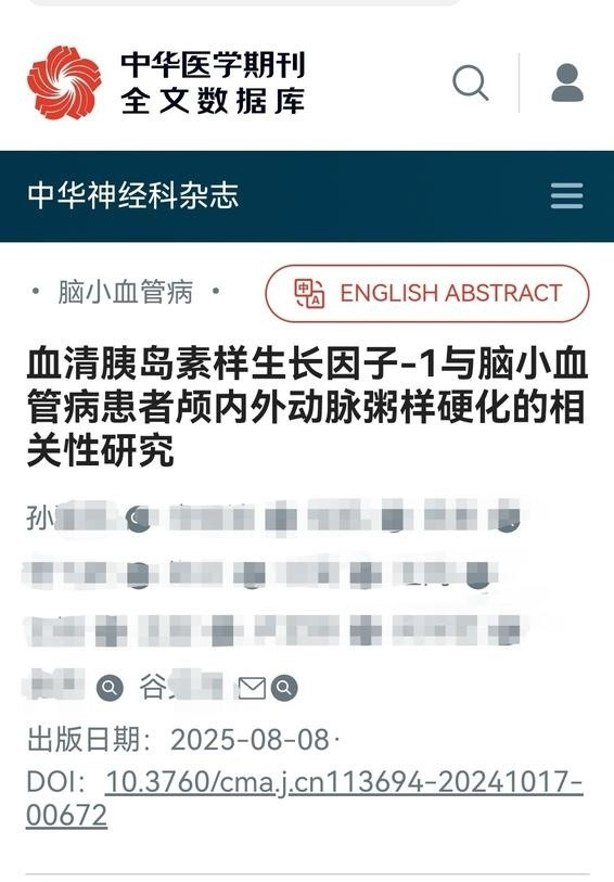 3月18日,针对孙同学的科研才略,封面新闻检索学术贵寓发现,孙同学曾以第一作家身份,在《中华神经科杂志》发表题为《血清胰岛素样滋长因子-1与脑小血管病患者颅表里动脉粥样硬化的干系性酌量》的著作,而其导师谷某某排行末尾。